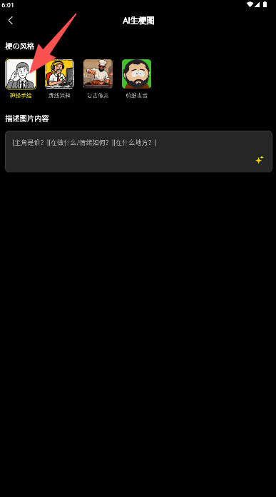 2、选择梗图风格在描述框输入图片内容。