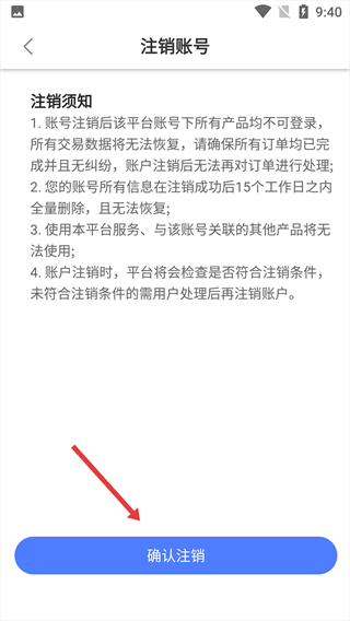 4、于注销账号页面,点击【确认注销】,以完成账号注销操作。