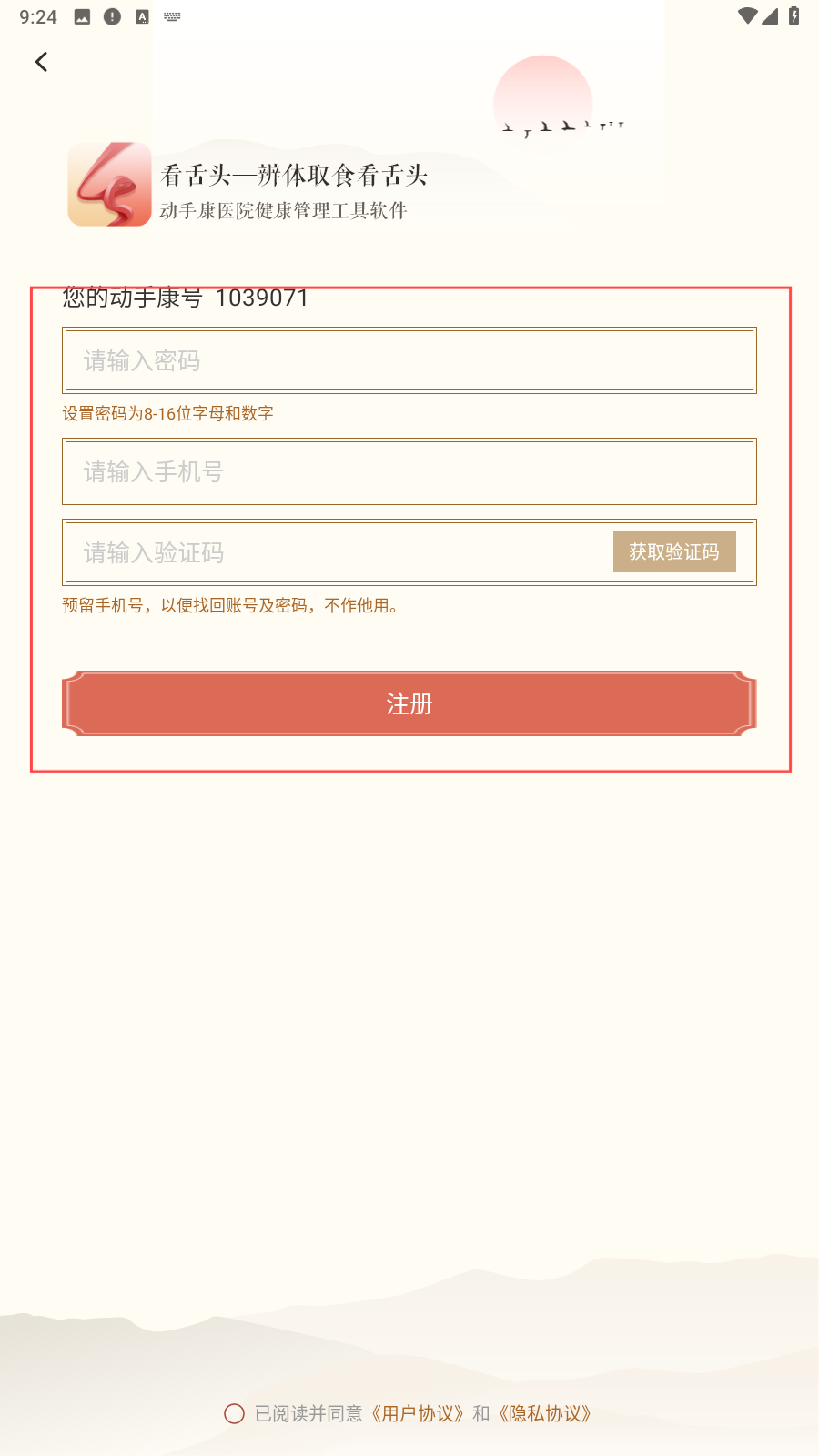 3、于注册界面填入【手机号】【验证码】【密码】便可。