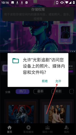2. 于权限请求弹窗里,点击【允许】按钮,给予“光影追剧”访问设备媒体内容的权限。