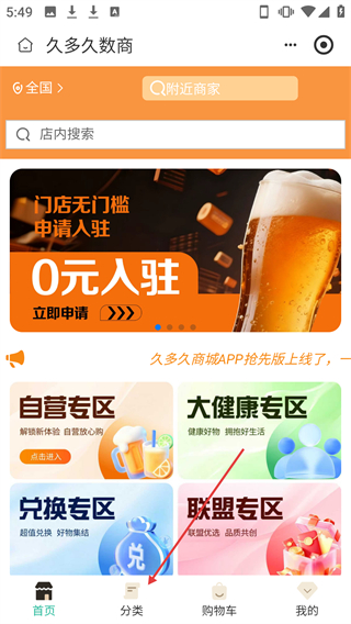 1. 于久多久数商的首页,点击底部的【分类】选项,就能进入商品分类页面。