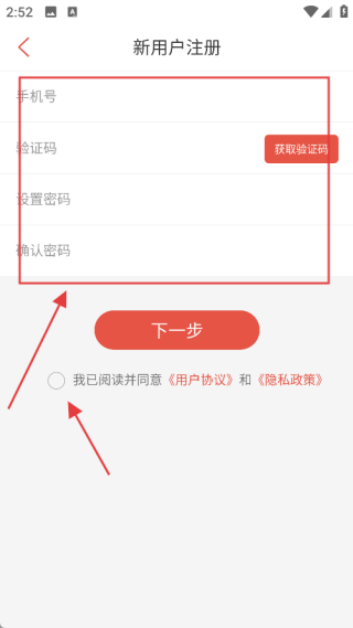 3、在注册页,依次【填写手机号、验证码】等信息,准备注册流程。