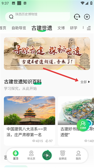 2进入【古建世遗】板块后,点击【全部】,尽情探索古建筑知识啦。