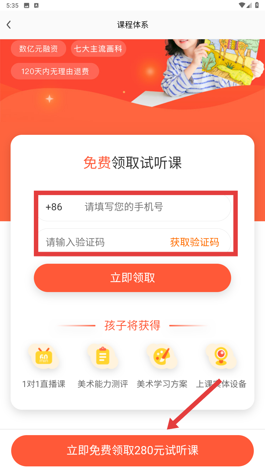 3、在课程体系页,填写手机号和验证码,点击【立即免费领取280元试听课】,即可推进报名流程哦。