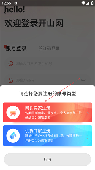 2、于登录界面点击【注册】,会弹出用于选择账号类型的弹窗,在此弹窗中进行注册类型的选择。