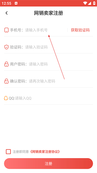 4、于注册页面填写手机号、验证码等相关信息,勾选协议,随后点击【注册】按钮以完成操作。