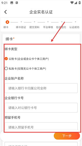 4、填入【企业账户名称】、【企业银行卡号】等相关信息,以完成认证。