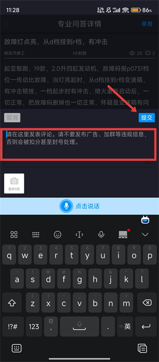4、在评论输入框中输入想要发表的内容,确认无误后点击【提交】按钮,就能完成评论发布,和其他汽修从业者交流啦。
