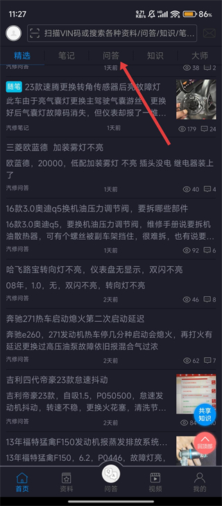 1、我们打开汽修宝典,点击顶部【问答】标签,就能浏览各类汽修问题啦。