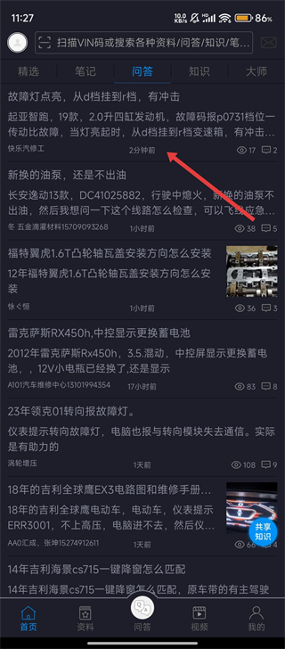 2、在问答板块中,选择一个感兴趣的汽修问题点击进入,查看问题的详细描述和相关信息哦。
