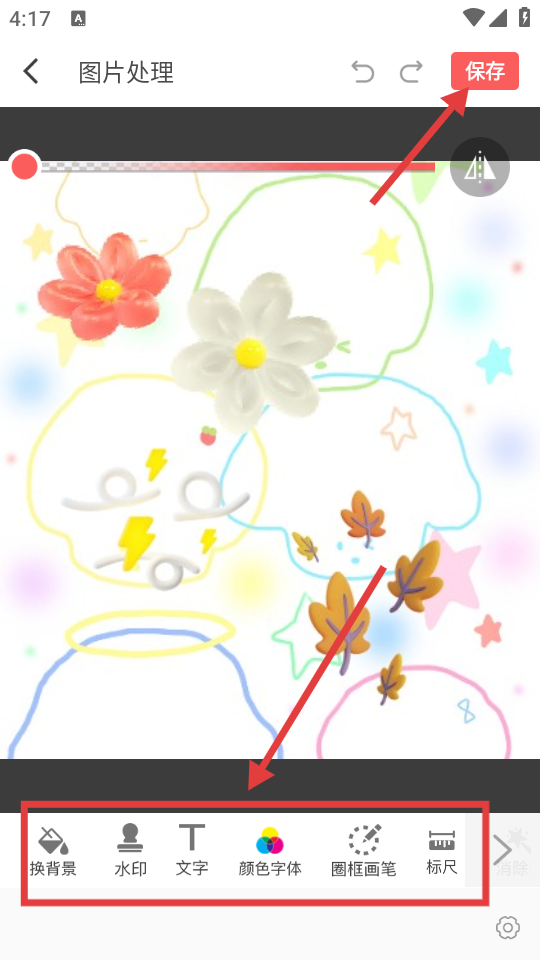 4可以借助更换背景、添加水印、插入文字等功能对内容进行调整,所有编辑操作完成后,点击页面上的【保存】按键即可。