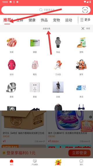 3、平台上正品商品种类丰富,涵盖服装、家居百货、数码电器、电脑办公等多个品类,详细的分类查看入口也设置在该区域。