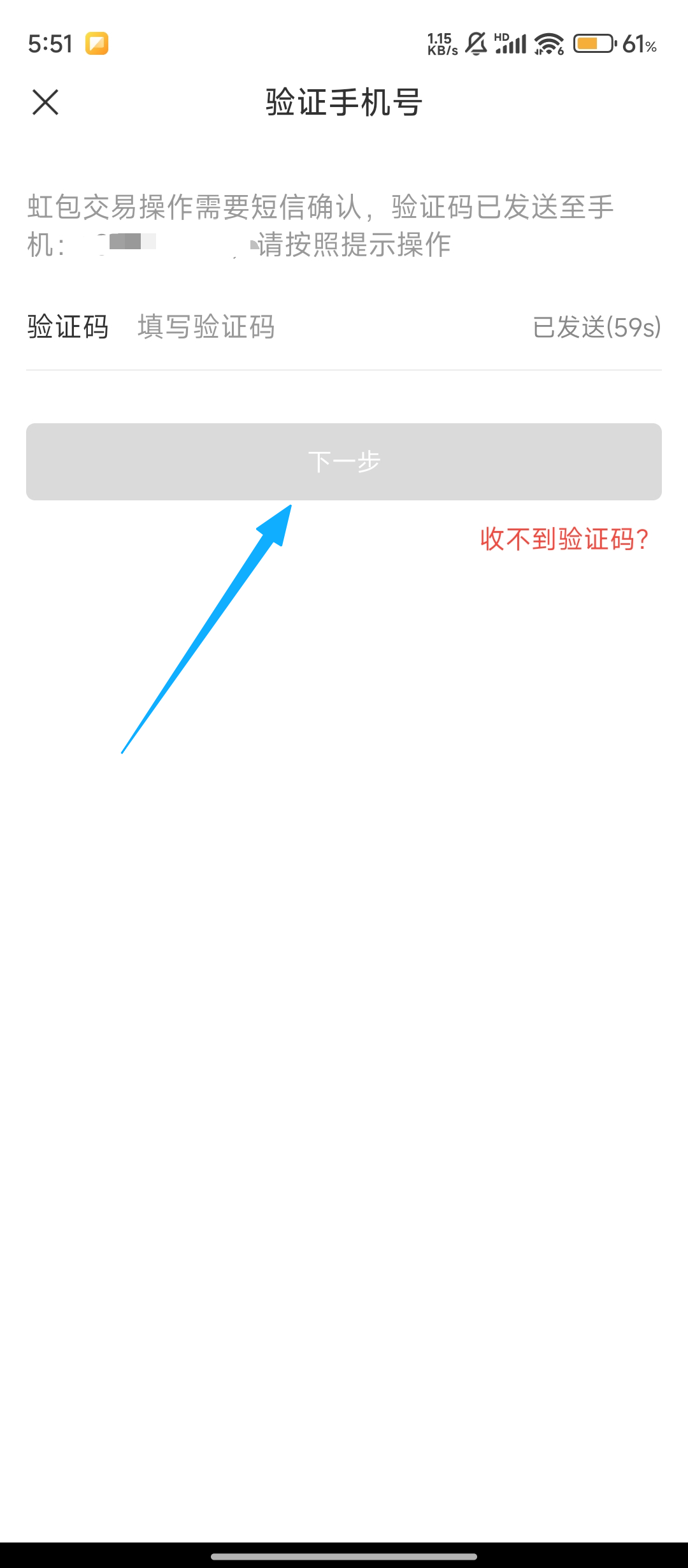 4、进入验证手机号页面后,输入收到的验证码,点击【下一步】按钮,即可完成购物卡的绑定操作,这样后续使用起来会更便捷。