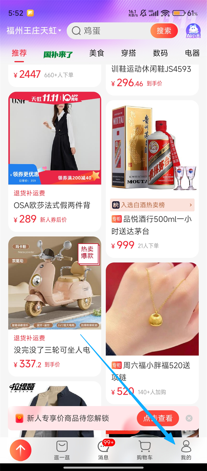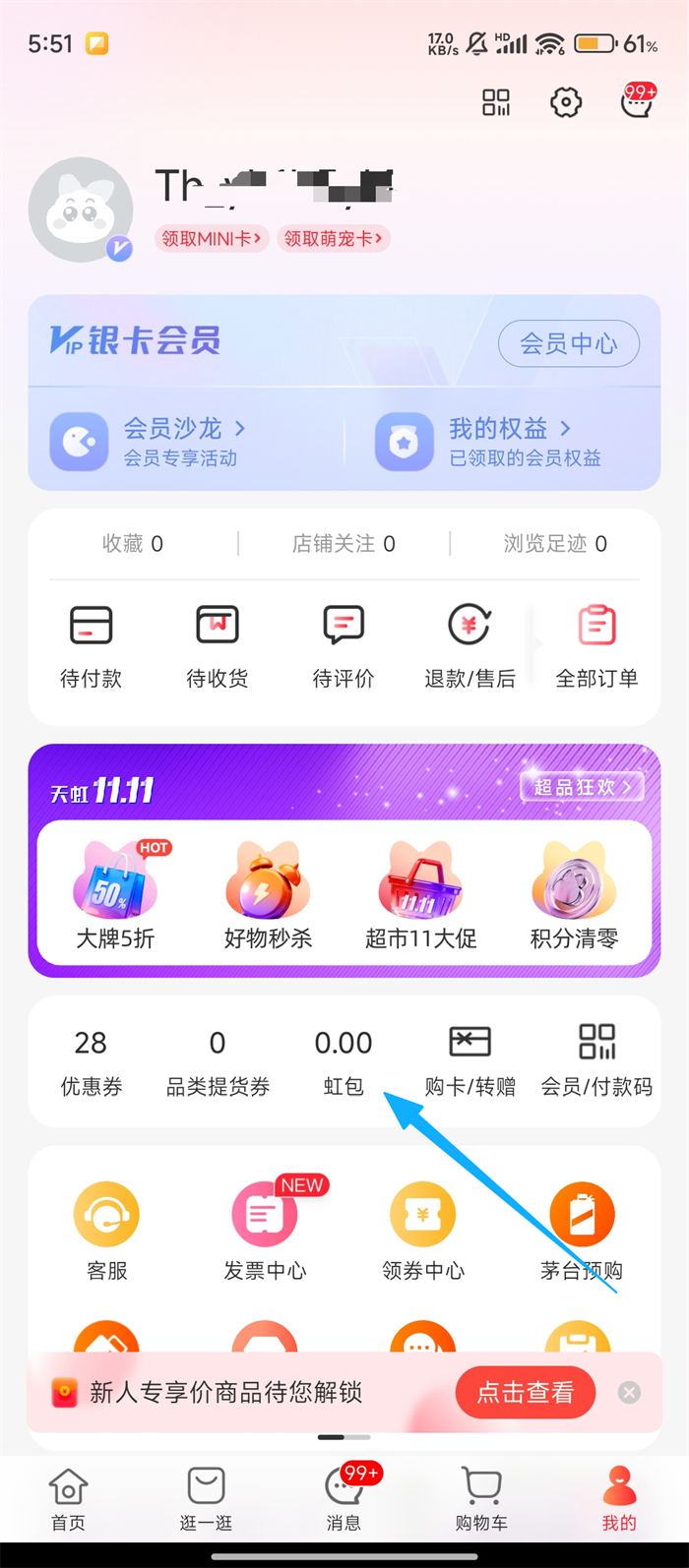 1若要为绑定购物卡做准备,可点击界面右下角的“我的”选项,这样就能进入到个人中心页面了。