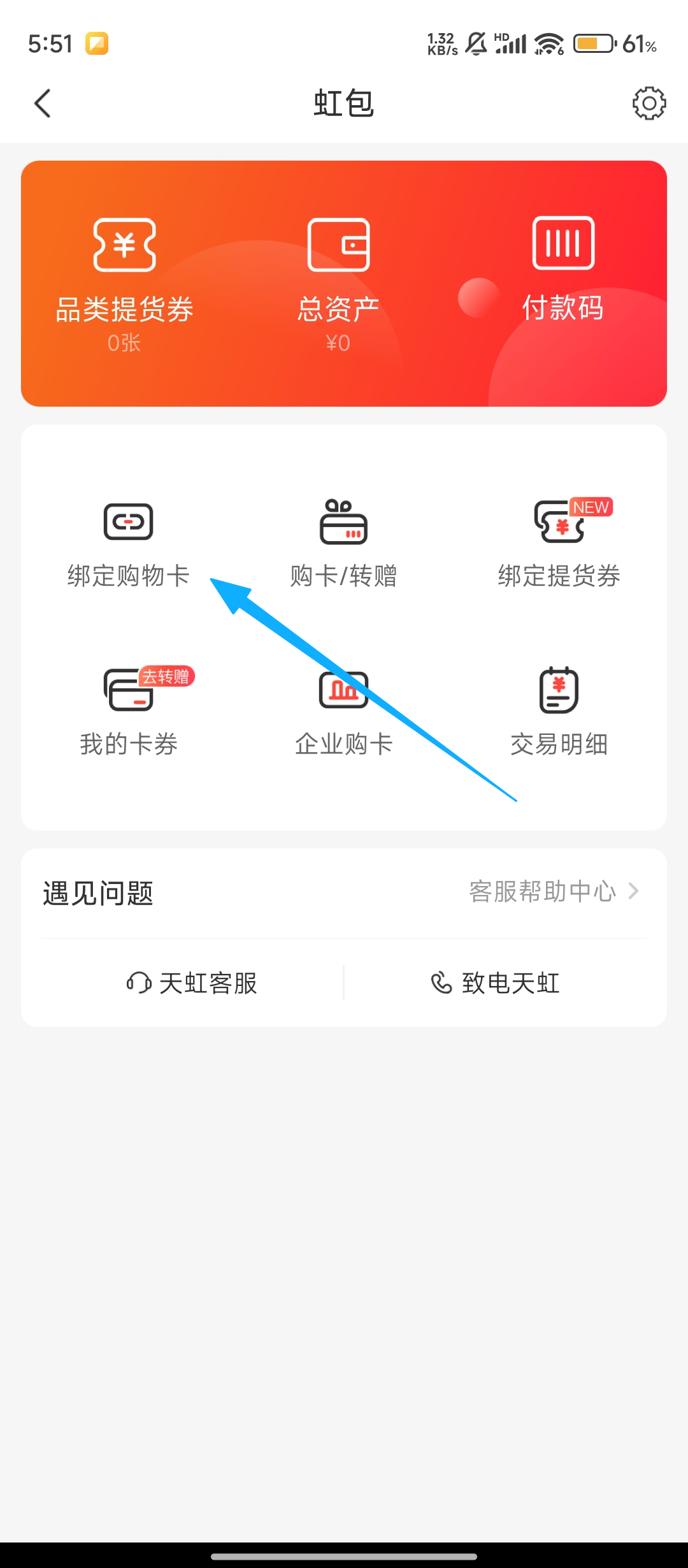 3、进入【虹包】页面后,点击【绑定购物卡】,就能开启绑定流程了。