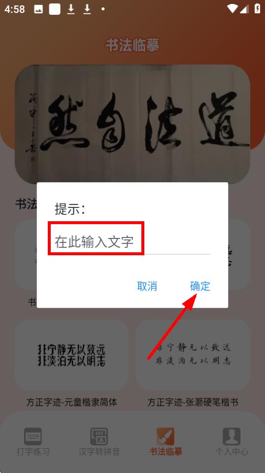 3、在提示框的【在此输入文字】处输入文字后,点击【确定】即可进入书法书写页面。