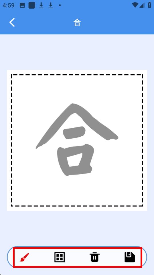 4、在书法书写页面,可使用底部的笔、田字格、删除、保存等功能进行书法练习。