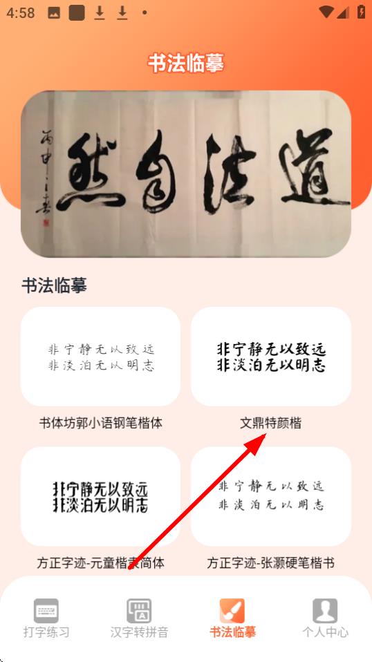 2、在【书法临摹】页面,点击【文鼎特颜楷】可进入文字输入环节。