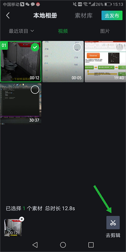 3、勾选手机中的本地视频,接着点击右上角“去发布”上传视频可以再上传之前剪辑视频。