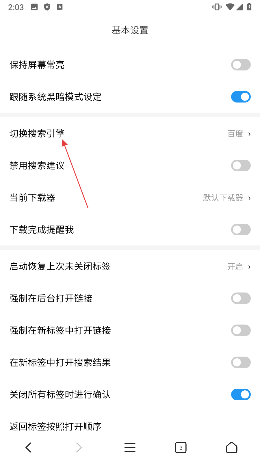 4、在基本设置页面,点击【切换搜索引擎】,即可进行搜索引擎切换操作。