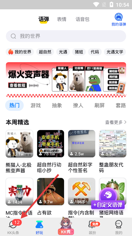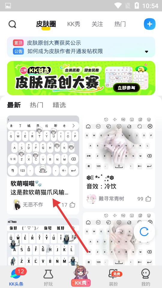 1打开KK键盘后,在应用底部找到并点击“KK头条”选项,即可进入皮肤圈页面。