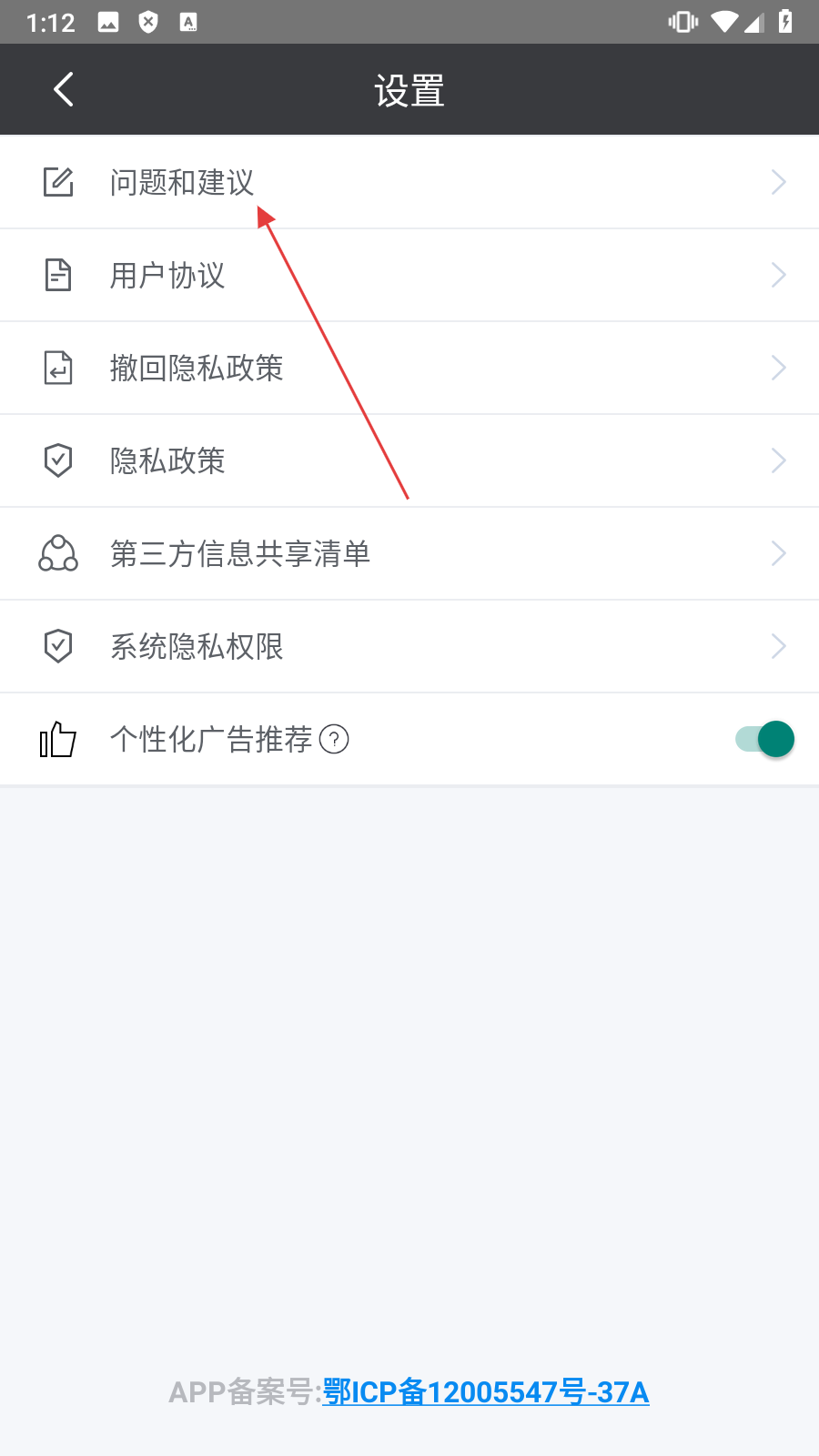 2、进入设置页面后,找到并点击【问题和建议】选项,即可进入意见反馈页面。