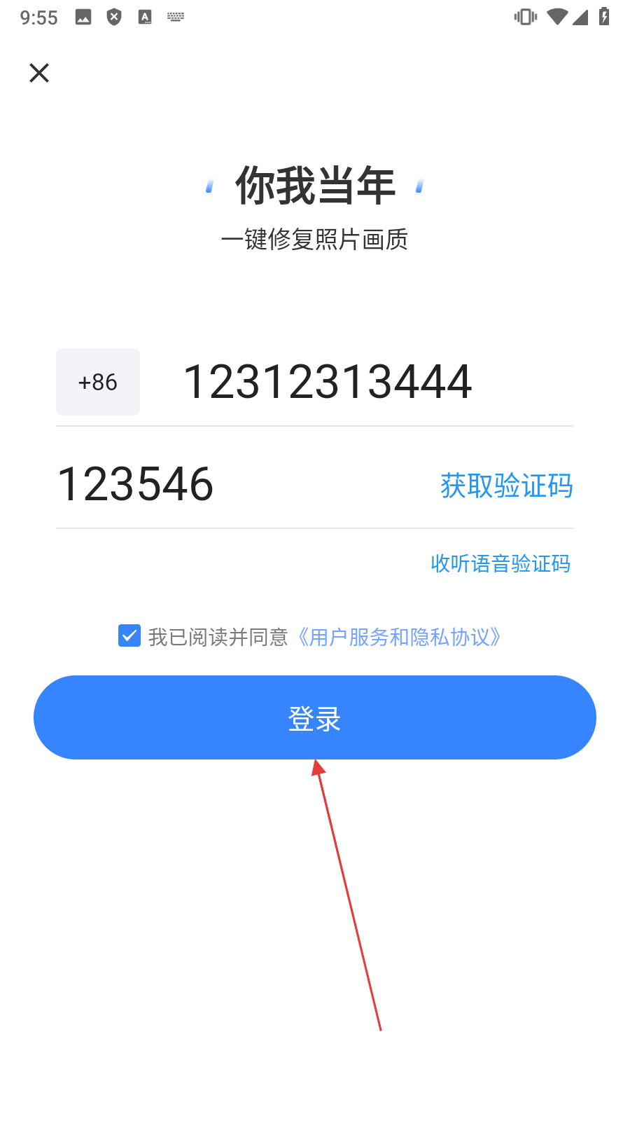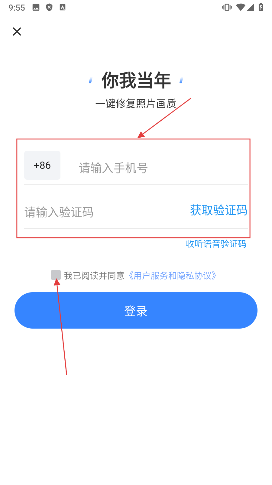 3、在登录页面,填写【手机号、验证码并同意协议】,准备登录。