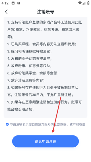 4、进入账号注销页面后,点击【确认申请注销】按钮,提交账号注销的申请。