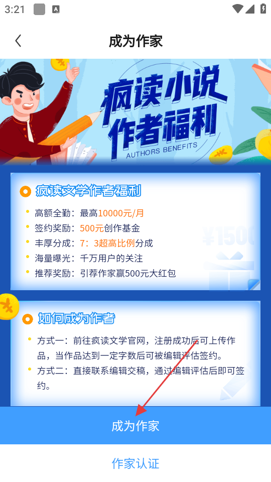 4、在成为作家页面中,点击【成为作家】按钮,即可按照提示步骤成为作家。
