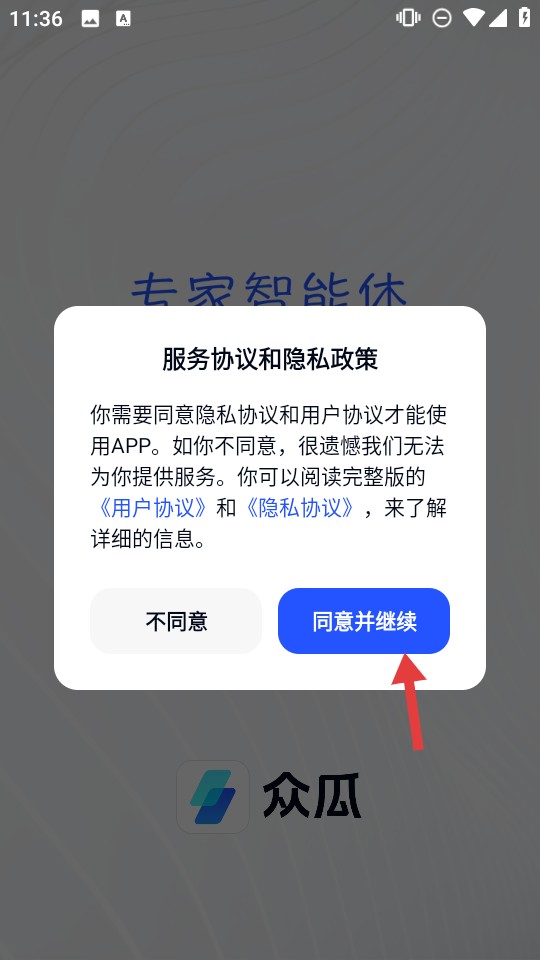 1请先仔细阅读相关的服务条款与隐私说明文件,确认无误后点击同意并继续的按钮,随后就能进入到智能体的探索页面了。
