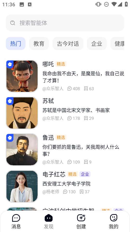 2、在发现页选择【热门-教育-古今对话】分类,也可以点击【哪吒-苏轼-鲁迅】等智能体进行互动。