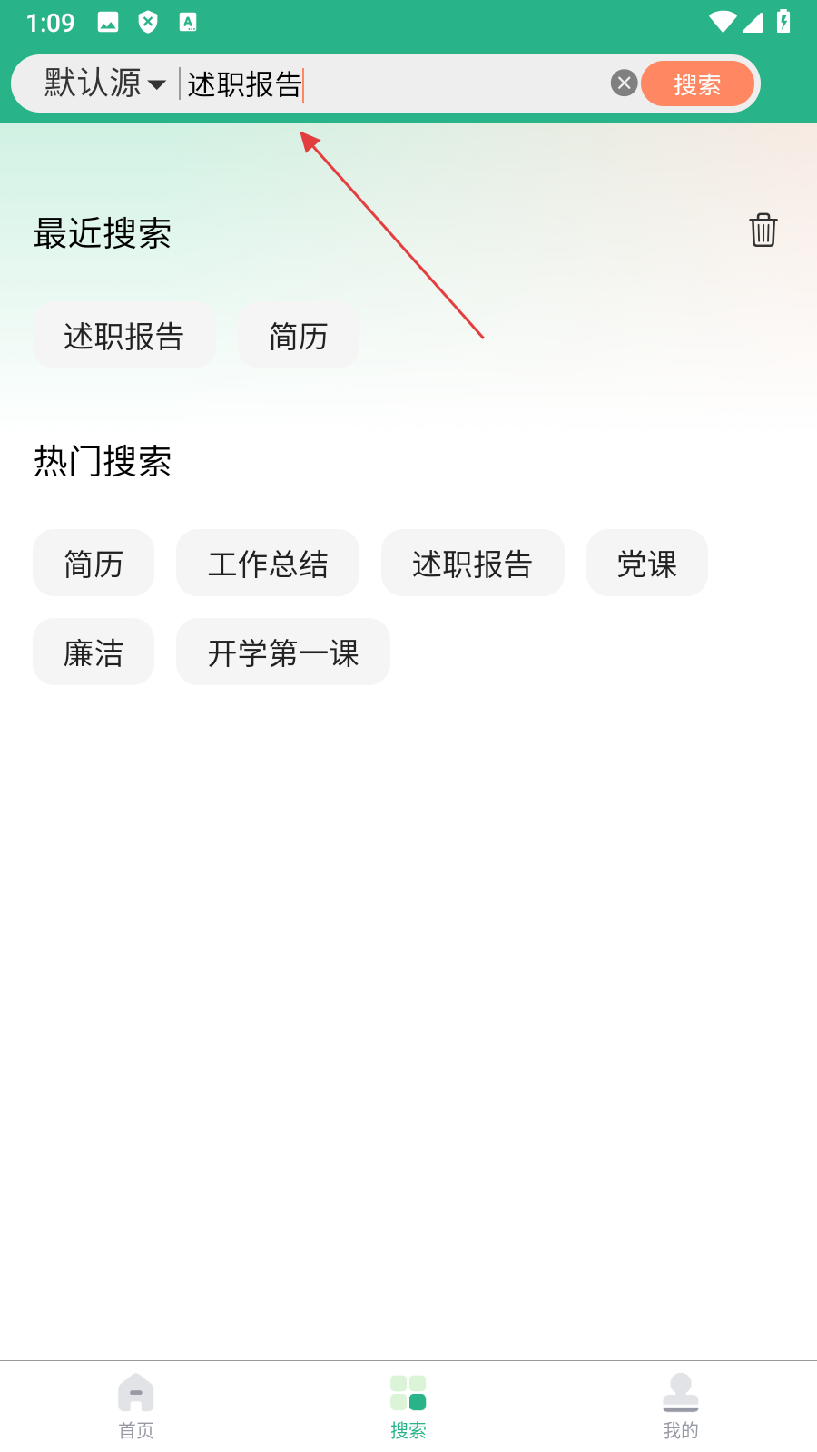 1打开搜索页面后,能对述职报告、简历这类文档进行检索,从而迅速定位到自己需要的文件。