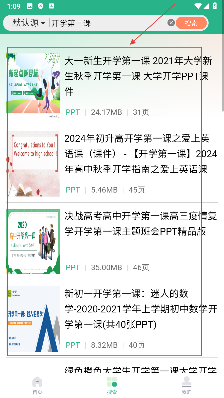2、搜索“开学第一课”,可以查看大一新生、初升高、高中等不同学段对应的开学第一课PPT课件。