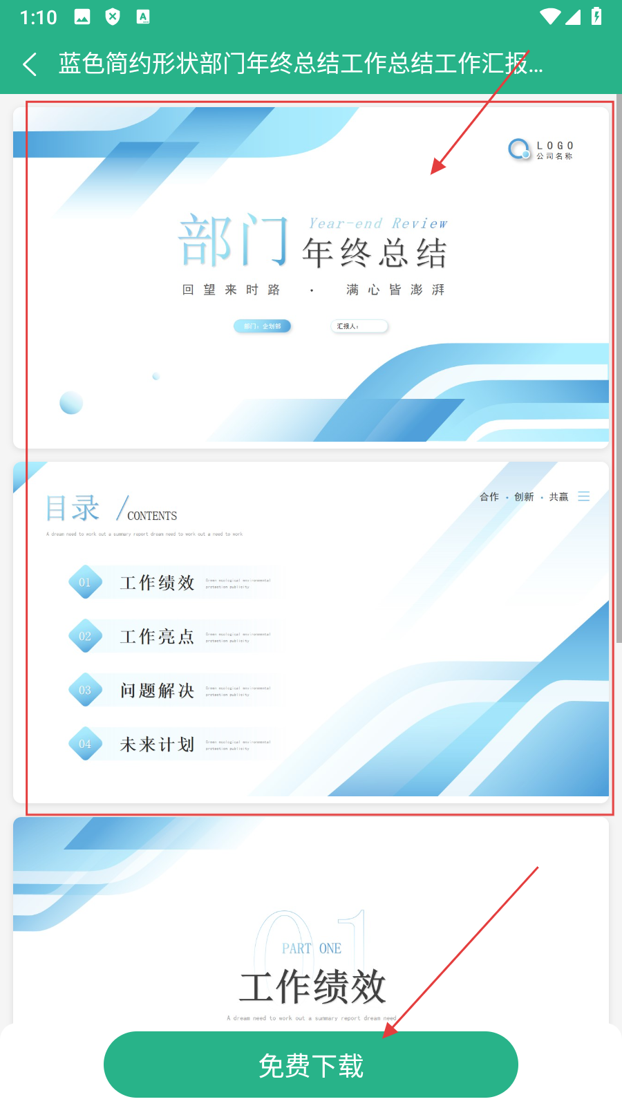 4进入目标文档的详情页面后,能够浏览这款蓝色简约风格的部门年终总结PPT具体内容,找到并点击“免费”按钮,即可完成该文档资源的获取操作。