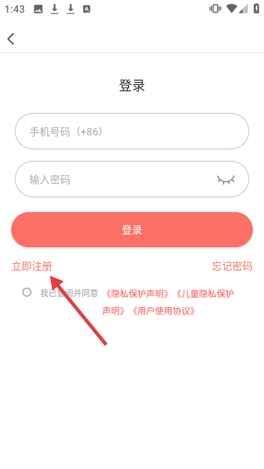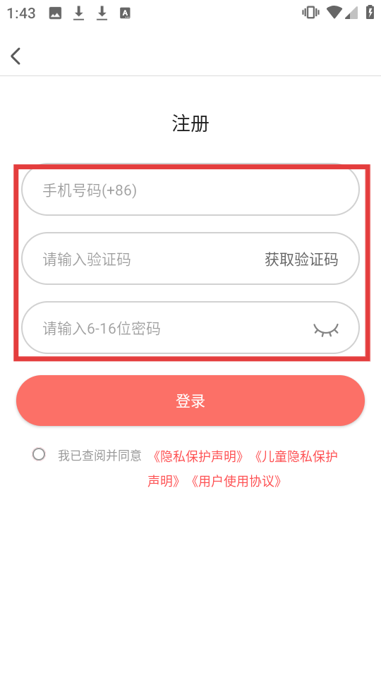 4在注册界面依次输入手机号、验证码以及6到16位的密码,勾选同意相关协议后点击登录按钮,就能完成注册并同步登录账号。