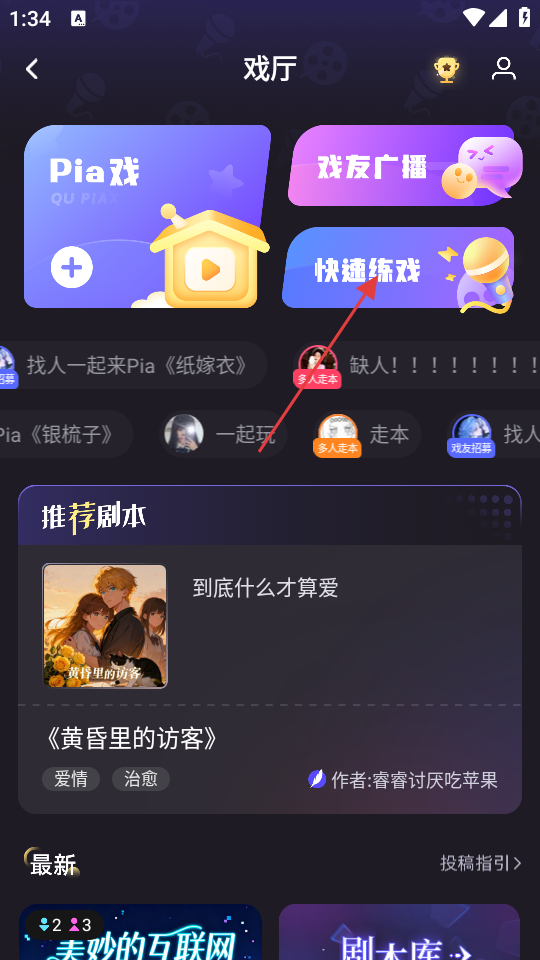 3进入快速练戏界面后,选定剧本,点击紫色的【Pia戏】按钮,即可进入剧本演绎的准备环节。