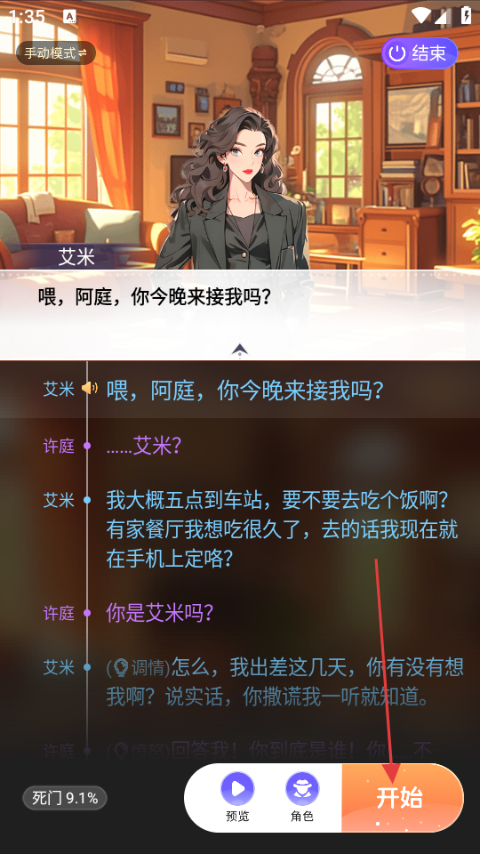 4、进入剧本演绎的准备界面后,找到橙色的【开始】按钮并点击,就能启动配音流程了。