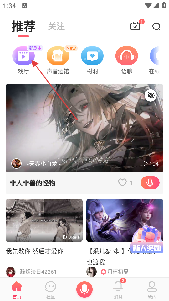 1、在推荐页面点击【戏厅】图标,进入戏厅板块。