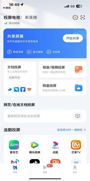 5. 投屏功能提供了两种便捷的连接方式:扫描二维码或输入投屏码。