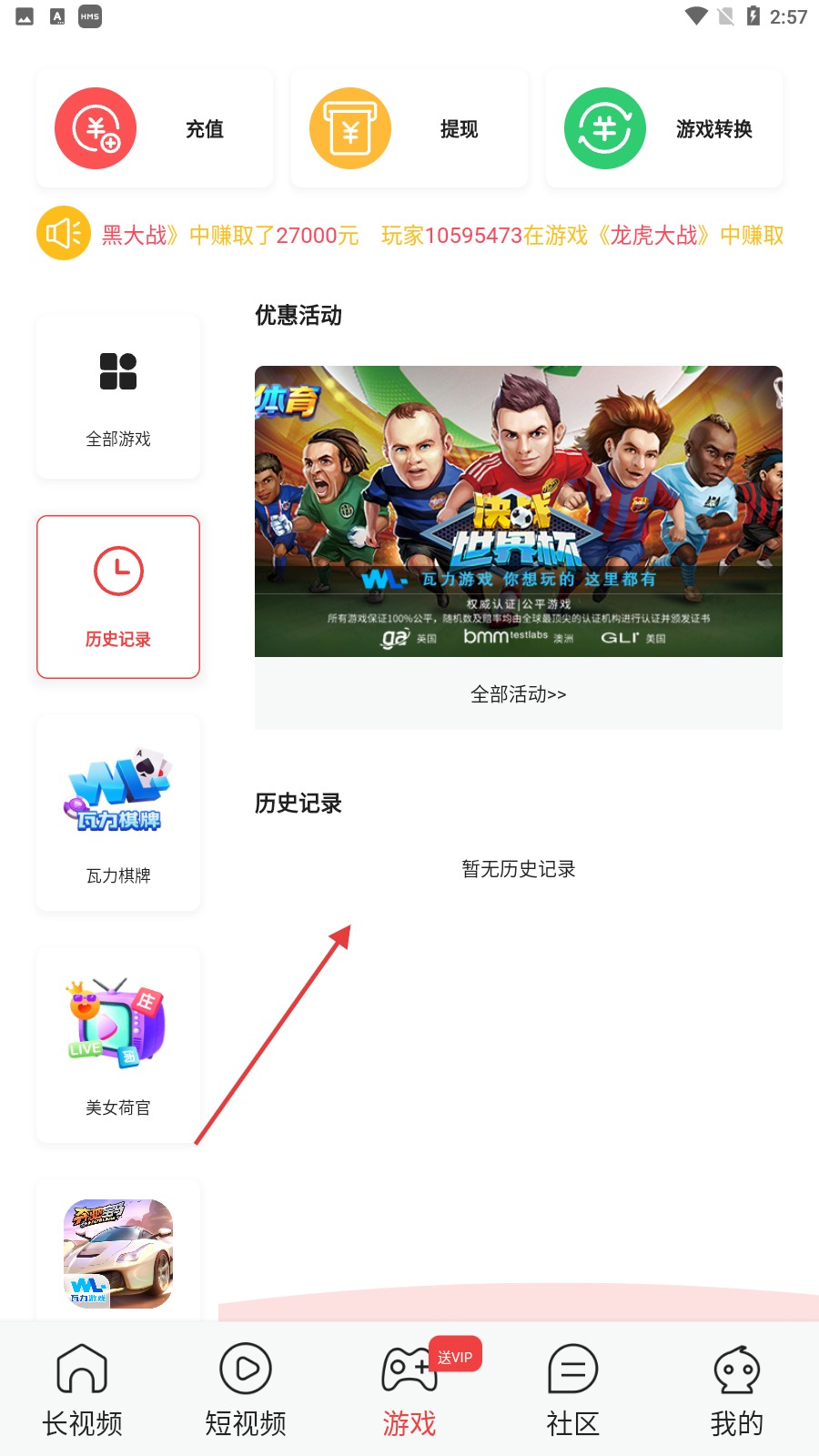 3、点击【历史记录】按钮,就能查看游戏的历史记录;要是还没有玩过游戏,就会显示【暂无历史记录】。