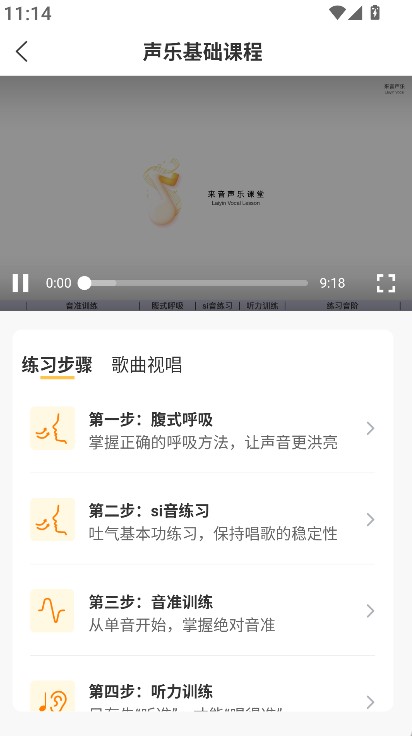 在声乐教学方面,包括呼吸、呼气、音准等课程,以及真人示范。视唱练耳模块还可以提供单音识别和旋律视唱练耳训练。