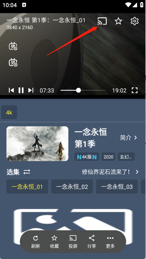 1、点开想看的影视资源进入到播放页面,点击右上角的投屏。