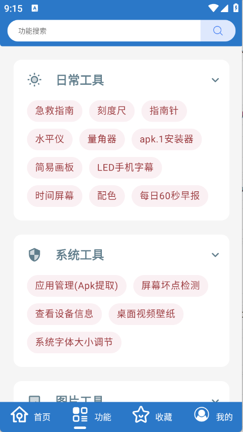2在“功能”页面里,各类实用工具资源被整合在一起,涵盖了日常所需的便捷工具、用于系统管理的相关工具,还有处理图片的各类工具等不同类别。