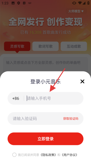1、进入登录界面后,通过【输入手机号并填写验证码】的方式完成登录,即可进入小元音乐,开启你的创作之旅。