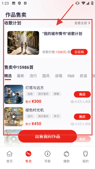 3进入交易页面后,能够查看歌曲收购规划与正在出售的音乐作品,并进行音乐相关的买卖操作。