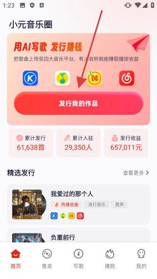 4进入首页后,能浏览小元音乐圈并发布个人创作,体验音乐上线与收益获取的相关服务。