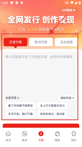 2进入写歌界面后,你可以选择“灵感写歌”或“互动成歌”模式,以此体验写歌服务。