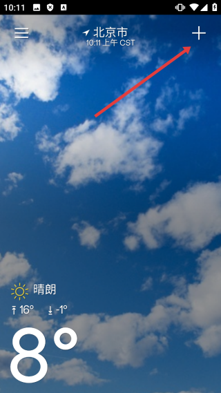1、在天气界面,点击右上角【+】,进入城市搜索界面。