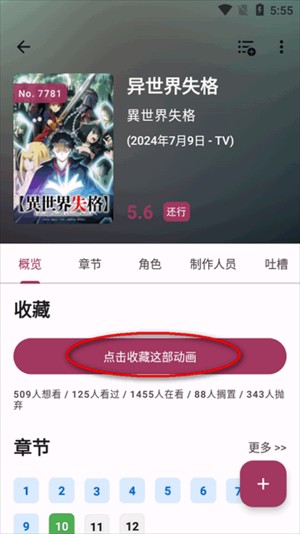 2进入某部动漫的详情页面后,点击页面下方红框标识的按钮,即可完成该动漫的收藏操作。