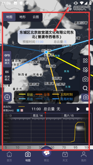 1、进入首页界面,可【查看天文与天气信息,包括日出日落、金色时刻、天气状况】等,享受天文天气综合查询服务。